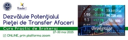 Camera de Comerț a României, în colaborare cu TradeX – Transfer Afaceri și International Business Brokers Association, te invită să participi la un curs intensiv și practic de Brokeraj în Afaceri, conceput pentru a-ți oferi toate instrumentele și cunoștințele necesare pentru a excela în acest domeniu dinamic.